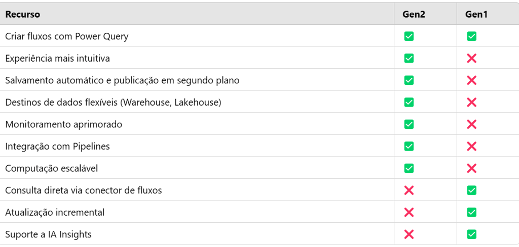 O Dataflows Gen2 elimina muitas limitações da versão anterior e traz uma experiência mais moderna, porém alguns recursos ainda não foram incorporados, como a atualização incremental e suporte direto a IA Insights.